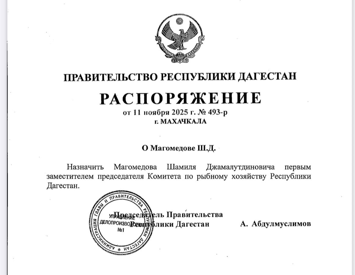Шамиль Магомедов назначен первым заместителем председателя Комитета по рыбному хозяйству Республики Дагестан.