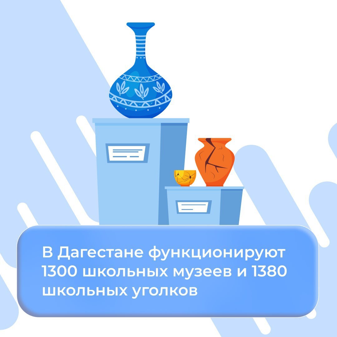 Для сохранения и пропаганды культурно-исторического наследия, воспитания подрастающего поколения в духе культурных традиций народов в общеобразовательных учреждениях Дагестана созданы музеи.