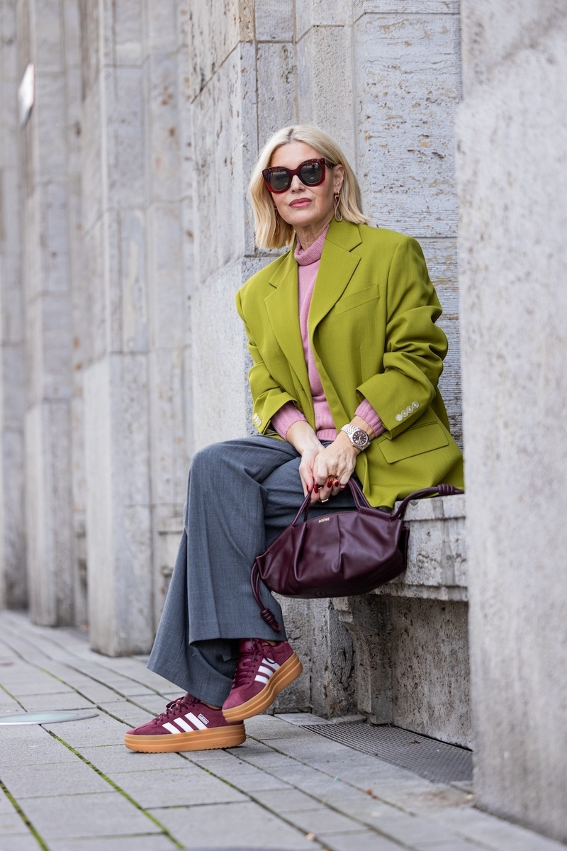 - Цветовая игра: Петра умеет комбинировать смелые оттенки, создавая яркие образы. Например, серые брюки свободного кроя прекрасно сочетаются с розовым свитером и фисташковым жакетом, а обувь и сумка цвета бургунди добавляют изюминку.