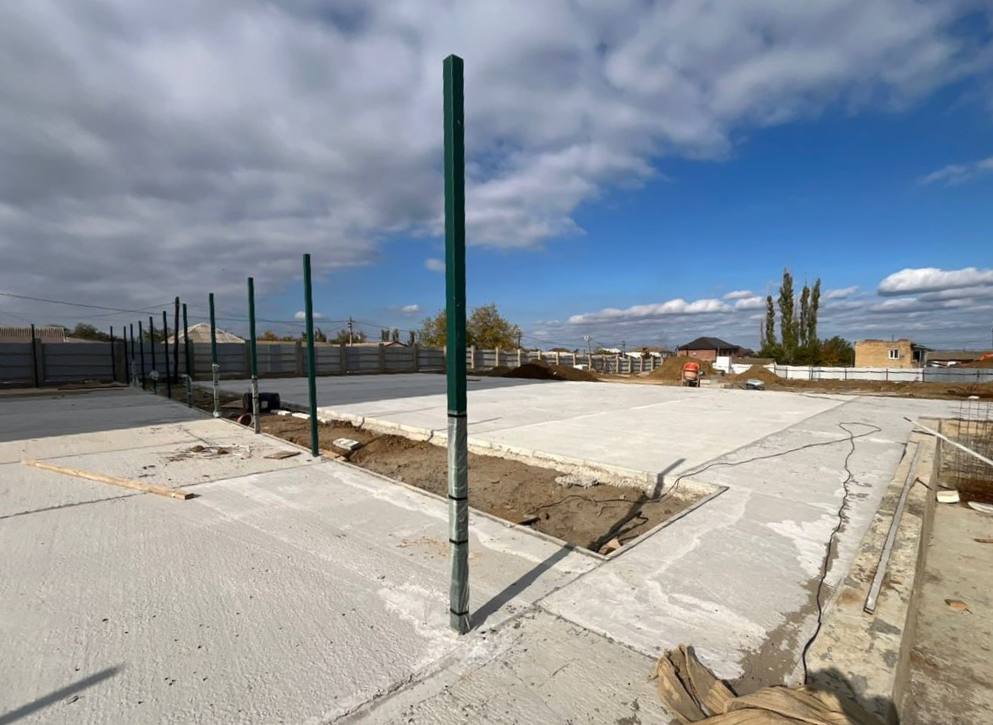 На фото проводится этап формирования основы под заливку площадки будущего футбольного поля и беговой дорожки вокруг него.