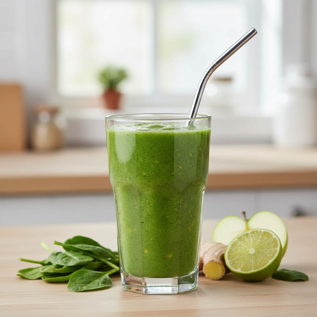 - Смешивание: в блендер добавьте сначала жидкость, затем зелень и фрукты. Начните на низкой скорости, постепенно увеличивая её до максимума, пока не получите однородную массу. Если смесь слишком густая — добавьте жидкости, если слишком жидкая — фрукты или лед.