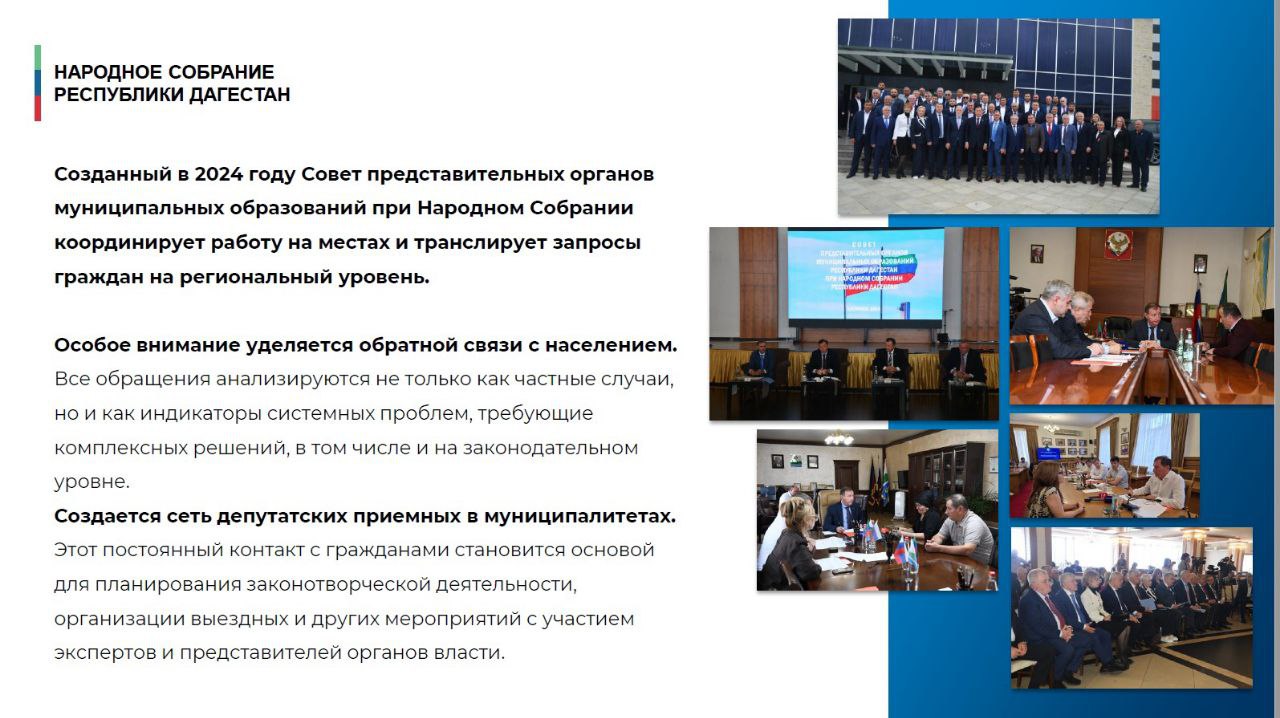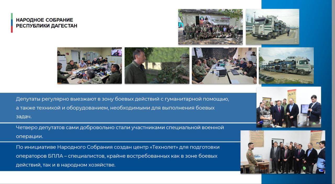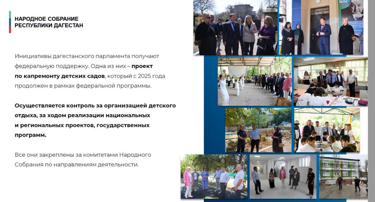 В частности, о парламентском контроле за ходом ремонта школ, детских садов, медицинских учреждений, о поддержке на федеральном уровне инициатив законодательного органа Дагестана, содействии, оказываемом Народным Собранием участникам СВО и членам их семей, помощи детям с ОВЗ, о межпарламентской деятельности и иных направлениях работы депутатов Народного Собрания.