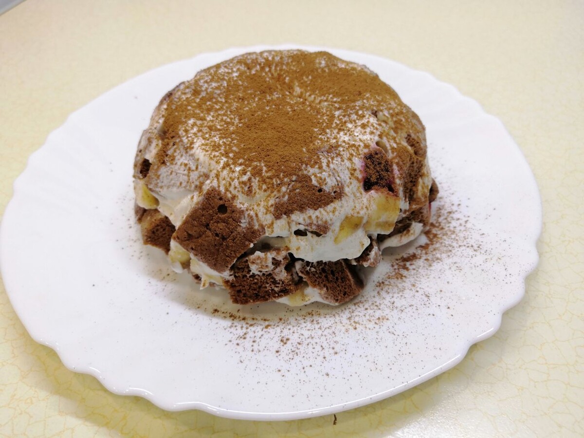 5. Охлаждение и подача. Заверните торт пленкой и поставьте в холодильник на два часа. После этого уберите пленку, переверните готовый торт на блюдо и аккуратно снимите пленку с верхней части. По желанию, посыпьте торт какао для дополнительного декора.