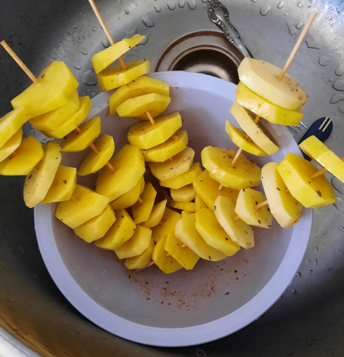 На деревянные шпажки аккуратно нанизать картофельные ломтики, оставляя между ними расстояние примерно в 1 см.