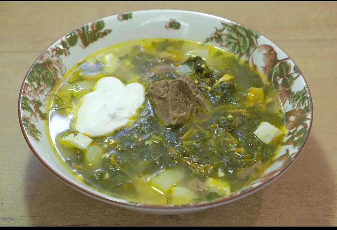 Когда мясо почти готово, картофель нарезают кубиками, а варёные яйца и щавель – мелко. Некоторые могут испугаться, что щавеля много, но он сильно уменьшится в объёме при варке, придавая блюду приятную кислинку. Также нарезается зелень—например, укроп или петрушка.