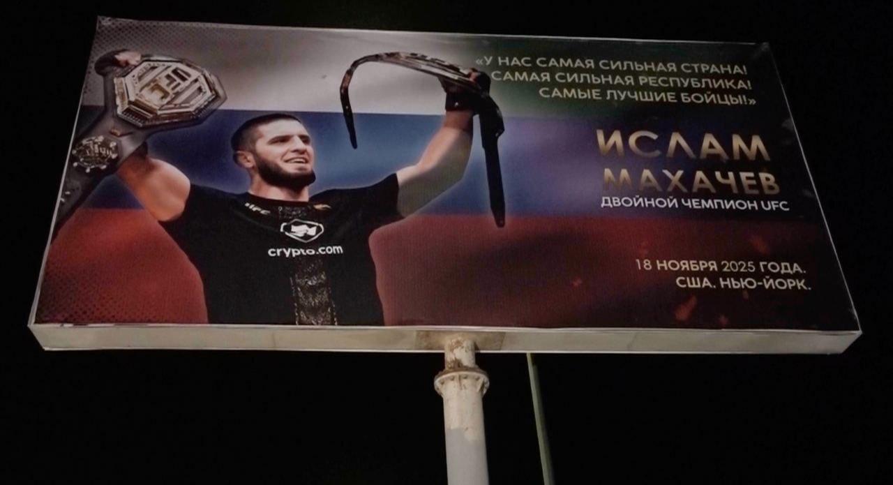 Возле махачкалинского аэропорта "Уйташ" установили билборд Исламом Махачевым и его цитатой "У нас самая сильная страна, самая сильная республика, самые лучшие бойцы".