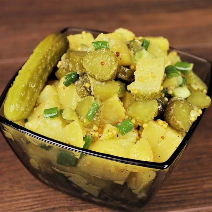 Сначала картофель требуется очистить и отварить в мундире до полной готовности. Дать ему остыть, а затем нарезать крупными кубиками. Маринованные корнишоны следует нарезать толстыми кругами, а зеленый лук — мелко измельчить после того, как его тщательно промоют и обсушат.