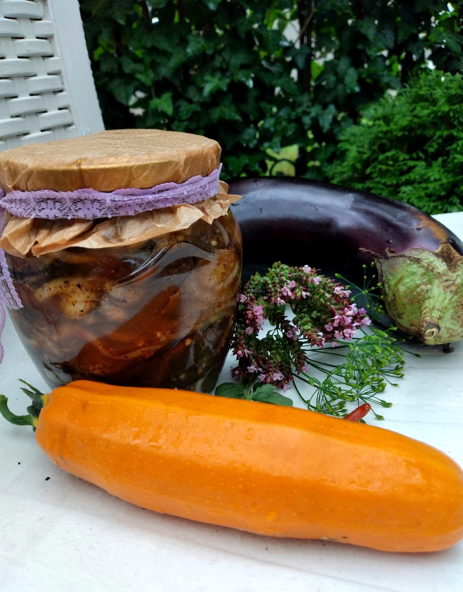 После 6-8 часов ожидания, закуска раскладывается по стерилизованным банкам, а на каждую порцию добавляется немного растительного масла. Далее банки ставятся на стерилизацию, и, витая в ароматах лета, они готовы к хранению.