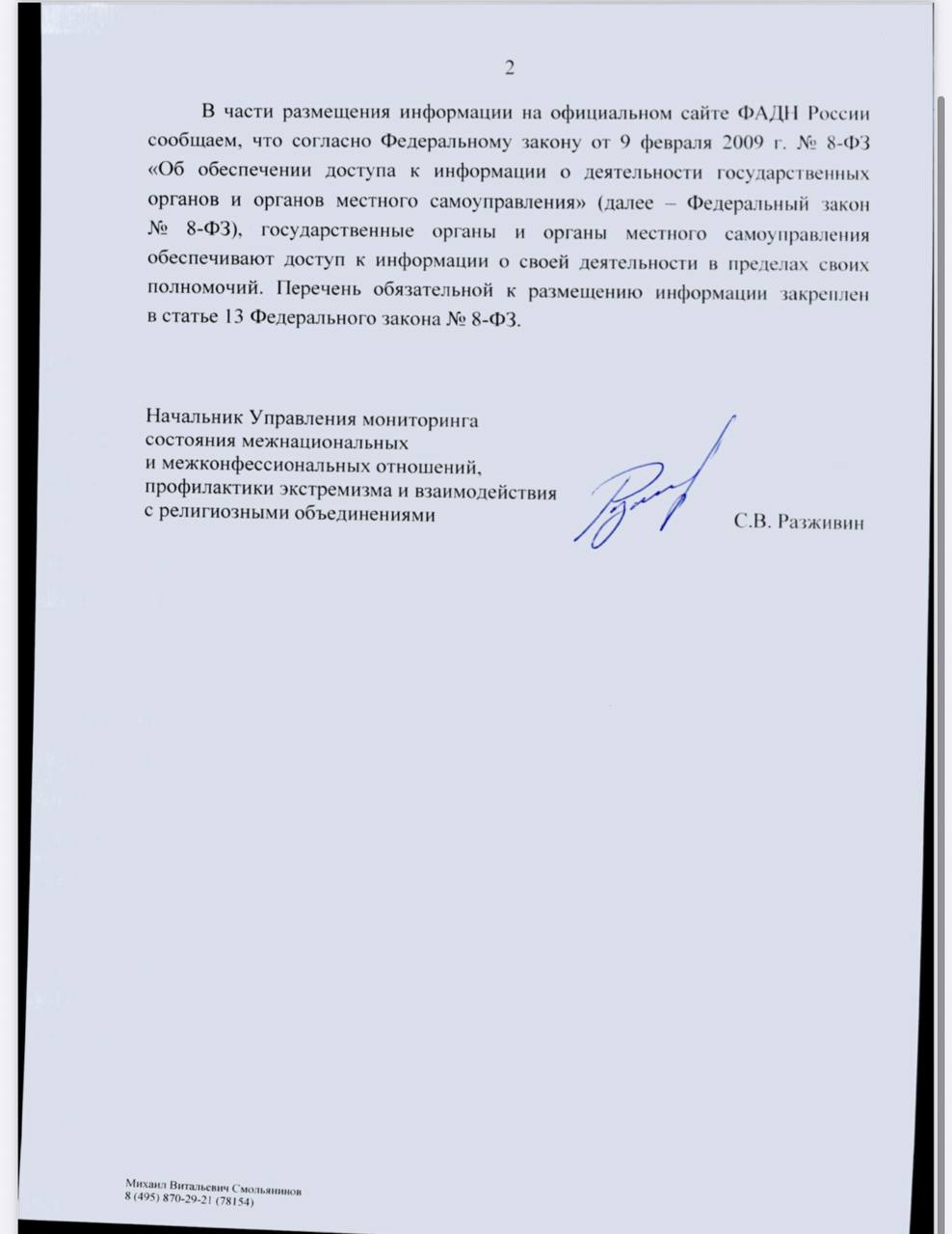 Как вы знаете, мною был направлен официальный запрос в Федеральное агентство по делам национальностей (ФАДН России) в связи с волной публикаций в СМИ (таких как URA.RU, Samddn.ru и др), которые утверждали, что ФАДН «напомнил о штрафах за публичные намазы», приравняв их к митингам.