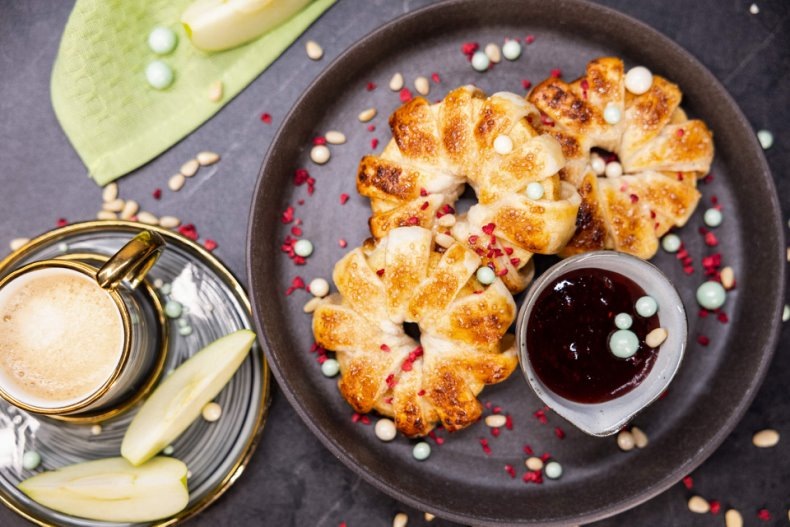 Начать следует с подготовки яблок. Очистить их от кожуры и нарезать кольцами толщиной около 1 см, не забывая аккуратно вырезать сердцевину.В отдельной миске тщательно смешать белый и коричневый сахар с корицей. Этой ароматной смесью натереть яблочные кольца, чтобы они пропитались сладким вкусом.Накрыть рабочую поверхность мукой и раскатать размороженное слоеное тесто до толщины около 5 мм.Сложить тесто в рулет, затем нарезать его на равные полоски толщиной около 7 мм.Каждое яблочное кольцо обмотать полосками теста так, чтобы яблоки оставались видны, придавая им при этом красивую форму.Подготовить противень, застелив его пергаментом. Выложить на него уложенные яблоки, разбить яйцо и хорошо взбить. Яичным меланжем смазать сверху подготовленные яблоки и посыпать коричневым сахаром.Разогреть духовку до 180°C и выпекать десерт в течение 12 минут до золотистого цвета.Готовую выпечку можно украсить сублимированной малиной и яркой посыпкой. Подача с любимым джемом добавит финальный штрих к этому восхитительному десерту. Прекрасный способ завершить любой день, насладиться вкусом осени и поделиться атмосферой тепла с близкими!