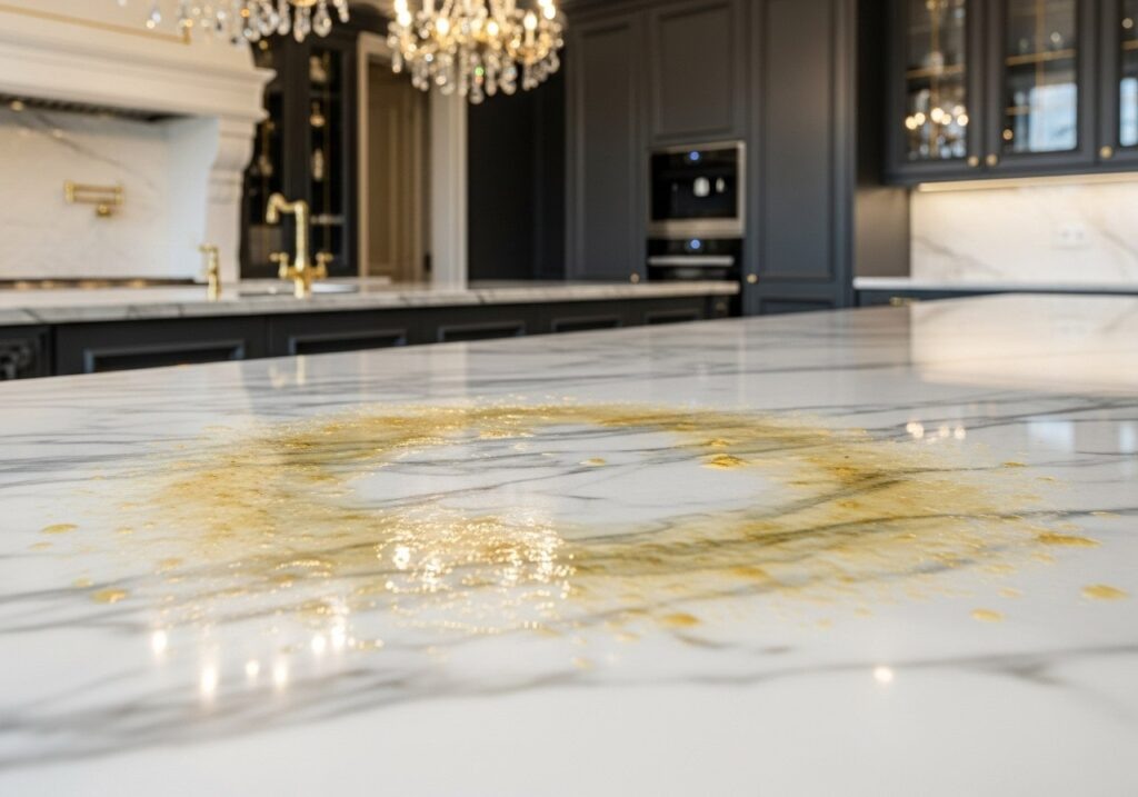 Гранит — это пористый материал с множеством микропор, напоминающих губку. При заводской обработке поры частично закрываются, однако со временем защитный слой стирается. Из-за этого масла, соусы и жирные остатки могут проникать в структуру камня, вызывая образование потемнений, которые со временем становятся стойкими. Глубина проникновения жира может достигать 5 мм, что делает поверхностную очистку неэффективной.