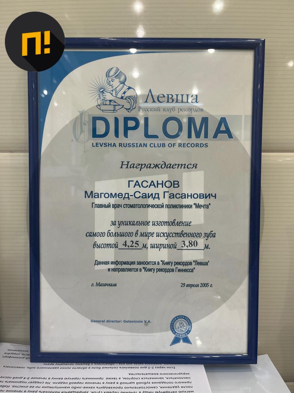 Главный врач клиники Магомедсаид Гасанов рассказал изданию «Подъём», что в 2005 году получил за скульптуру диплом клуба рекордов «Левша». По его словам, тогда властями «всё было согласовано».