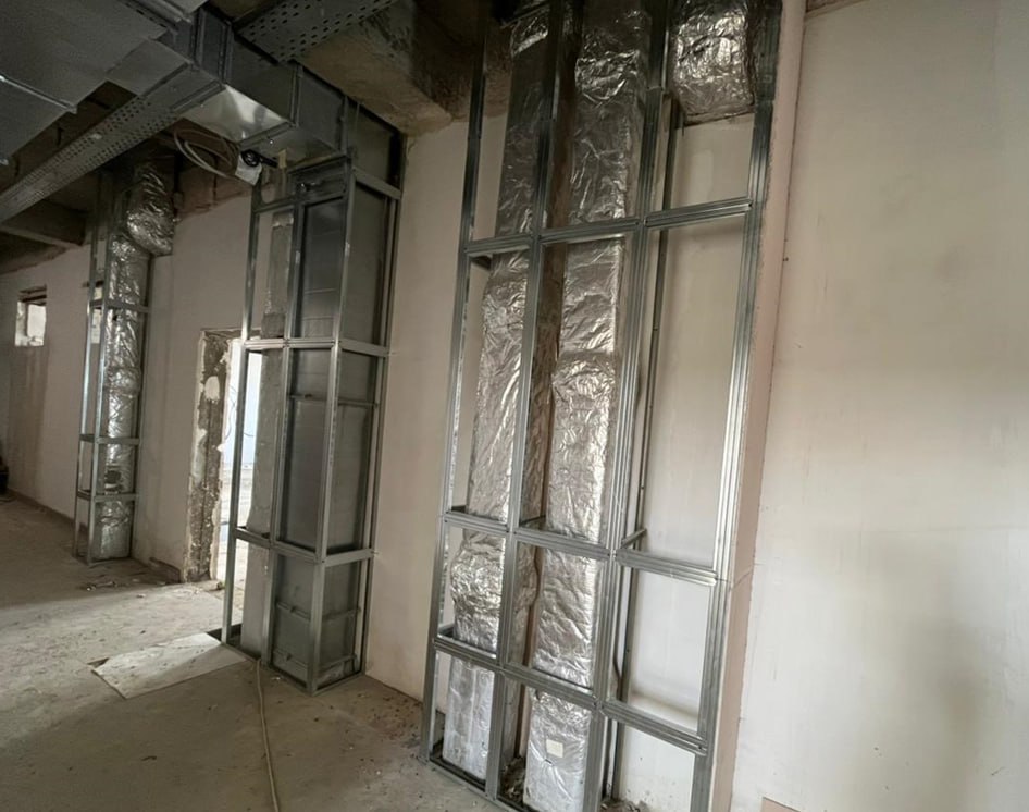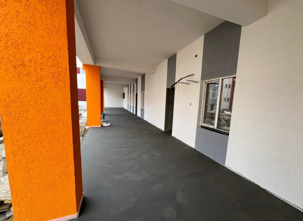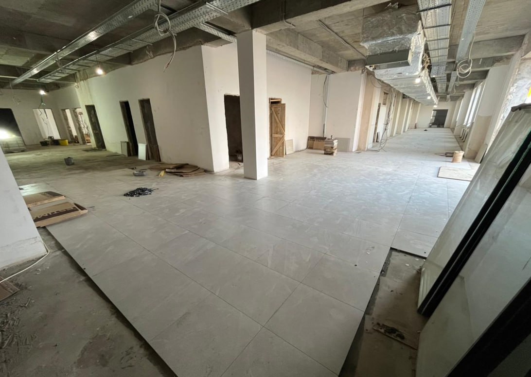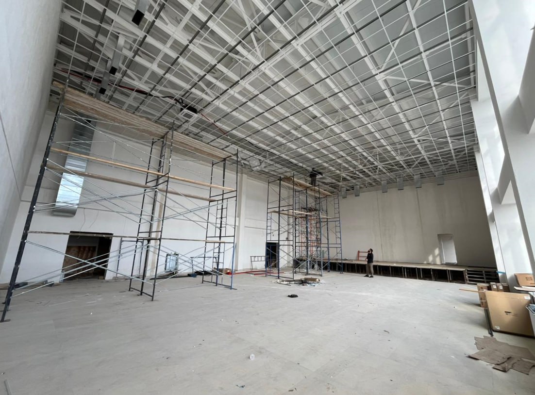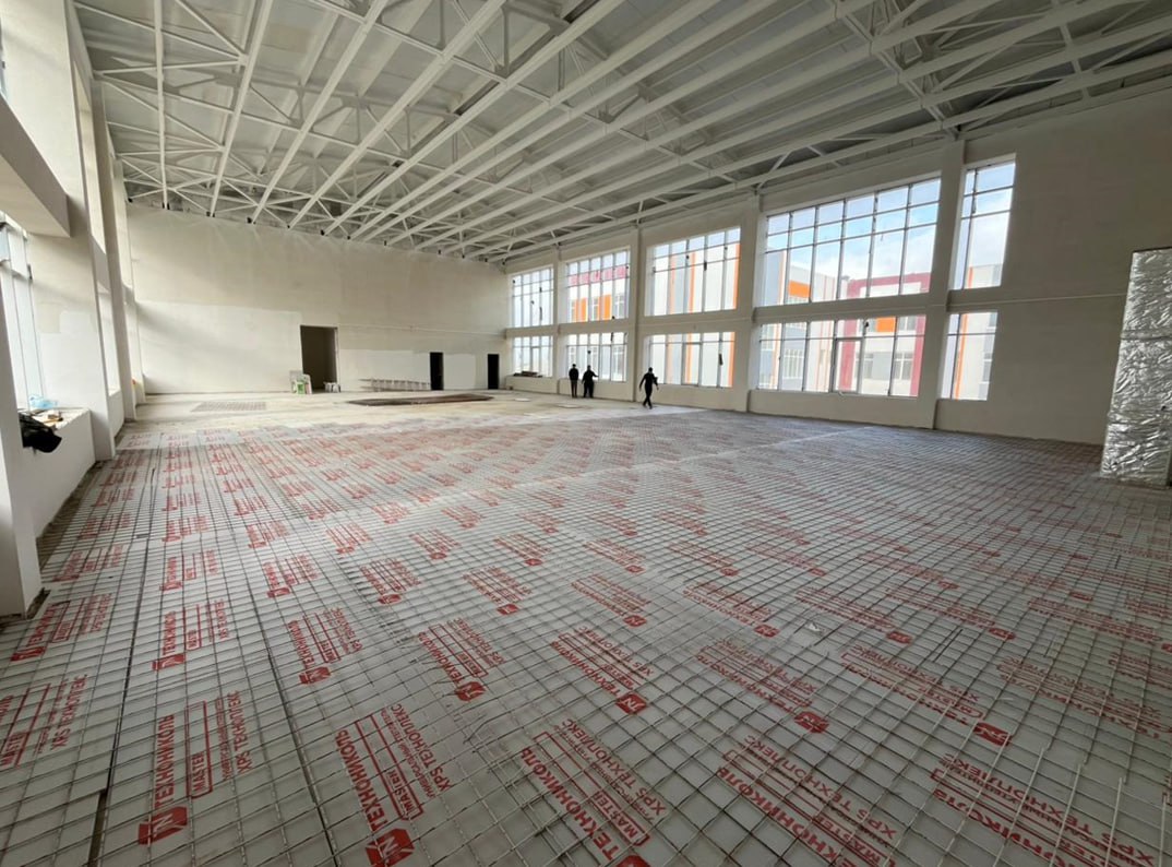 В настоящее время подрядчики ведут работы по отделке в актовом и спортивном залах, а также укладывают напольный керамогранит.