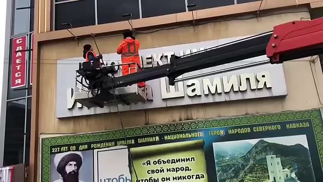 Работники МБУ «Благоустройство Махачкалы» устраняют последствия акта вандализма на троллейбусном кольце, где недавно злоумышленники сорвали баннер с изображением Имама Шамиля.