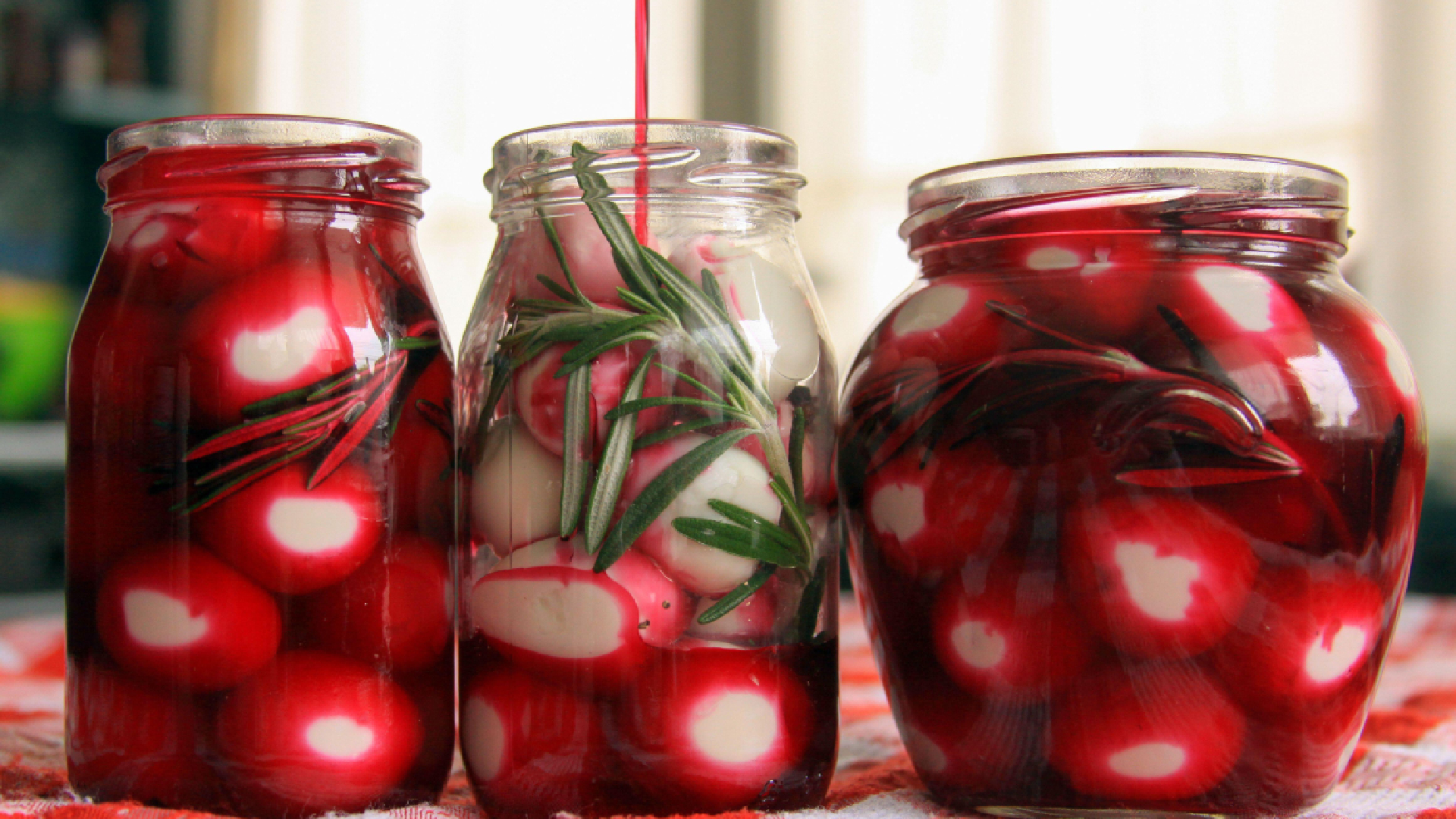 Аккуратно сложите очищенные яйца в банку с широким горлышком и залейте свекольным маринадом. Закройте крышкой и уберите в холодильник. Блюдо должно настаиваться минимум 6 часов. Перед подачей достаньте яйца из банки и украсьте зеленью, советует портал «Нямккин».