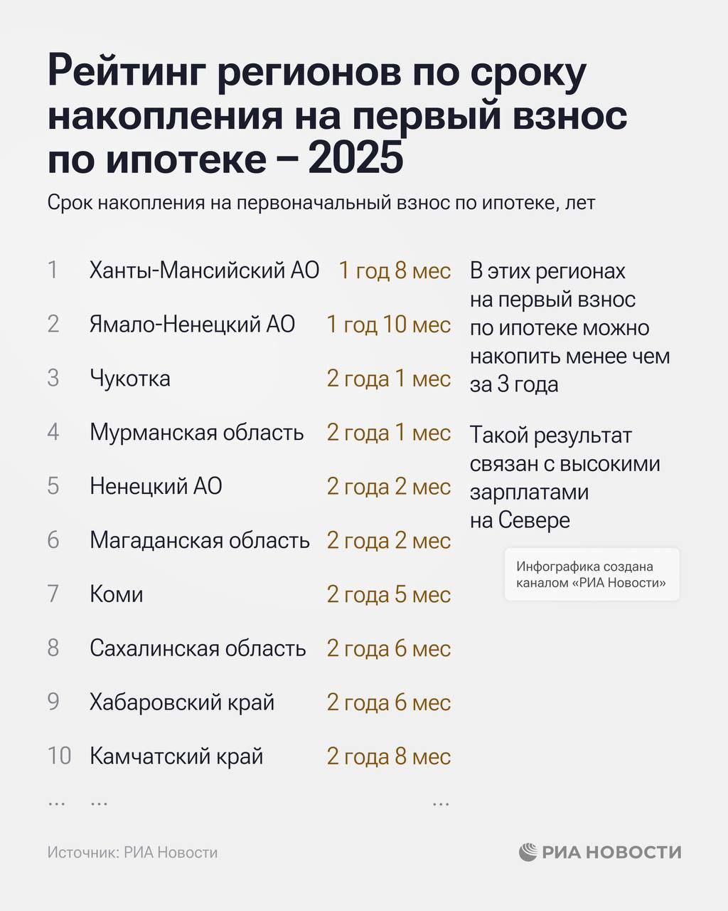Дагестан занял предпоследнее место в общероссийском рейтинге по сроку накопления на первоначальный взнос по ипотеке, который составляет 9 лет при сумме 1,66 млн рублей. Рейтинг, составленный РИА Новости, охватил 85 регионов. Лидерами по скорости накопления стали нефтегазодобывающие регионы: ХМАО (1,68 года), ЯНАО (1,82 года) и Чукотский АО (2,07 года). В конце списка, помимо Дагестана, оказались другие республики Северного Кавказа и Крым, где срок накопления варьируется от 8,43 до 9,08 лет. Новые регионы (ДНР, ЛНР, Запорожская и Херсонская области) в исследовании не учитывались.
