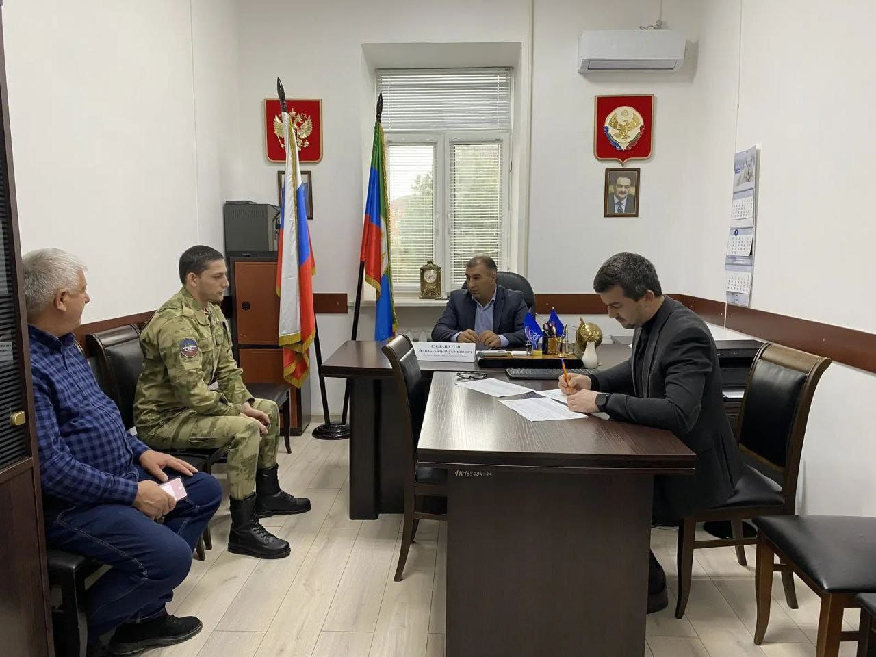 В администрации Карабудахкентского района Адиль Салаватов в Единый день приема выслушал участников СВО и трех матерей участников СВО. В своих обращениях они попросили депутата оказать содействие в получении земельных участков для участников, социальных выплат и гарантий, а также в асфальтировании улиц, где проживают участники СВО.