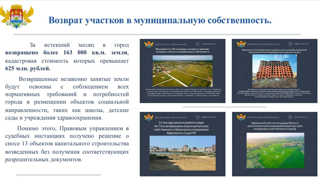 Руководитель Аппарата администрации Махачкалы Руслан Мамаев сообщил, что в ноябре 2025 года кадастровая стоимость возвращенных в собственность города объектов превысила 620 миллионов рублей. Общая площадь возвращенного имущества составила 163 тысячи квадратных метров.