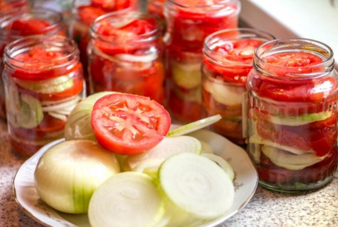 Процесс укладки помидоров в банку также играет ключевую роль. Для того чтобы они не двигались при обработке, необходимо укладывать их плотно, чередуя с крупными кольцами лука. Лук не только красив, но и помогает фиксировать томаты, предотвращая их деформацию. При этом важно, чтобы каждое кольцо лука было широким и плотным, чтобы обеспечить надёжную структуру.