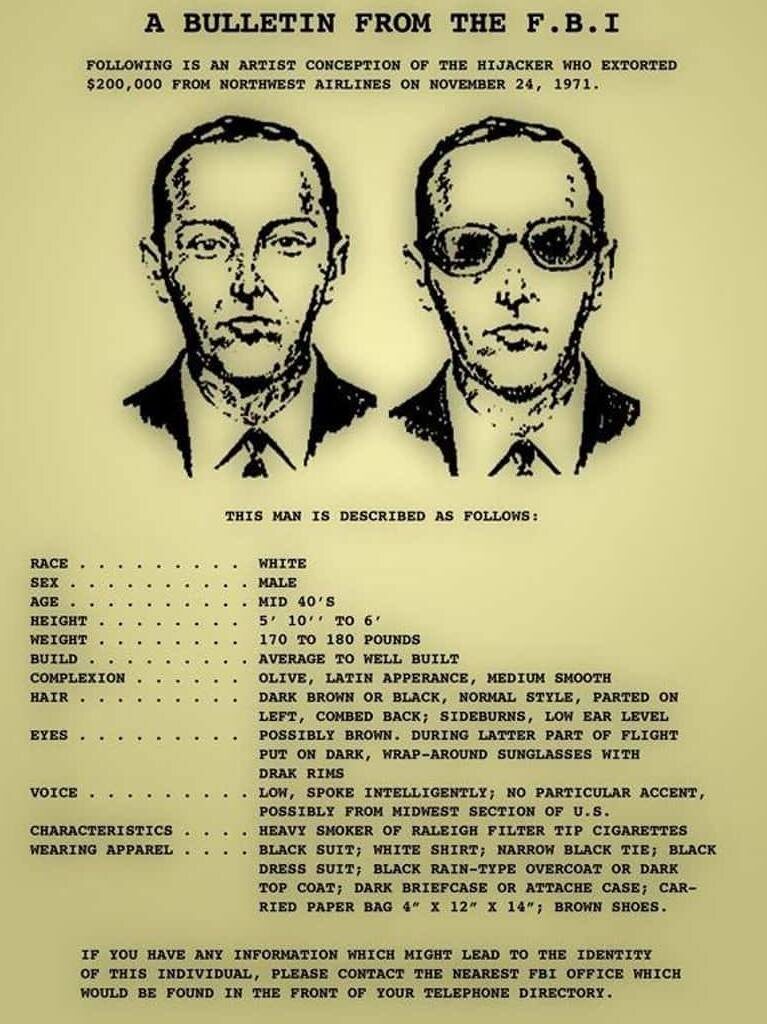 Мистическая история о загадочном угоне самолёта остаётся одной из самых интригующих в мире криминала. В 1971 году некий Д.Б. Купер, скрывающийся под вымышленным именем, захватил борт авиакомпании Northwest Orient Airlines и потребовал выкуп в размере 200 000 долларов, а также два парашюта. Что произошло дальше? Сумев получить желаемое, он исчез в холодной ночи, выпрыгнув с парашютом из Boeing-727 над Каскадными горами.