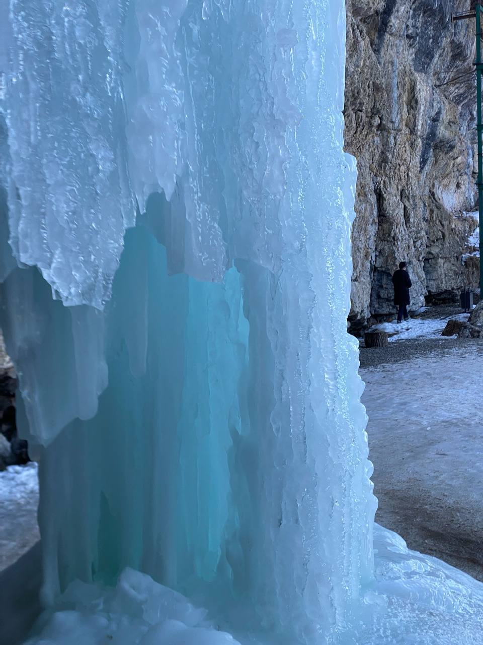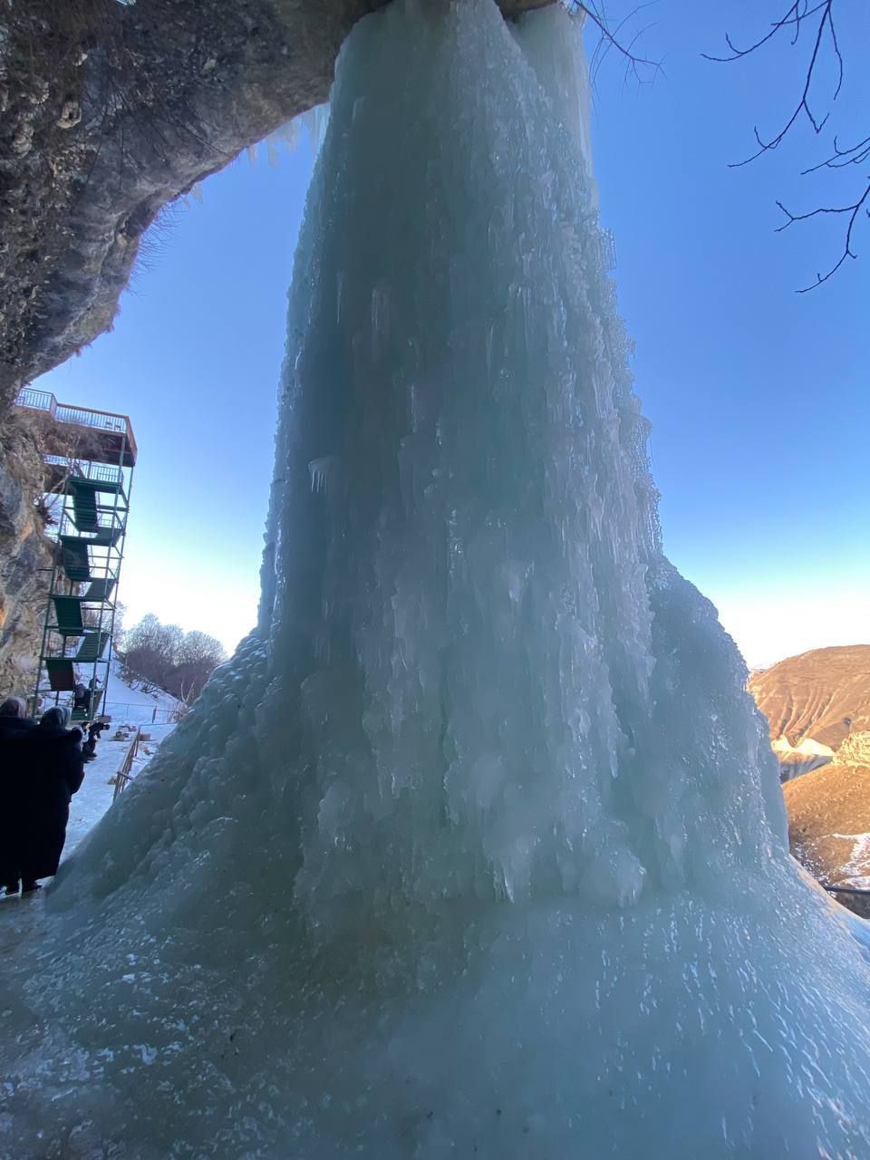 В Хунзахском районе один из таких следов - замёрзший водопад. Мороз превращает его в плотную ледяную стену, где можно разглядеть и светлые наплывы, и прозрачные кристальные выступы.