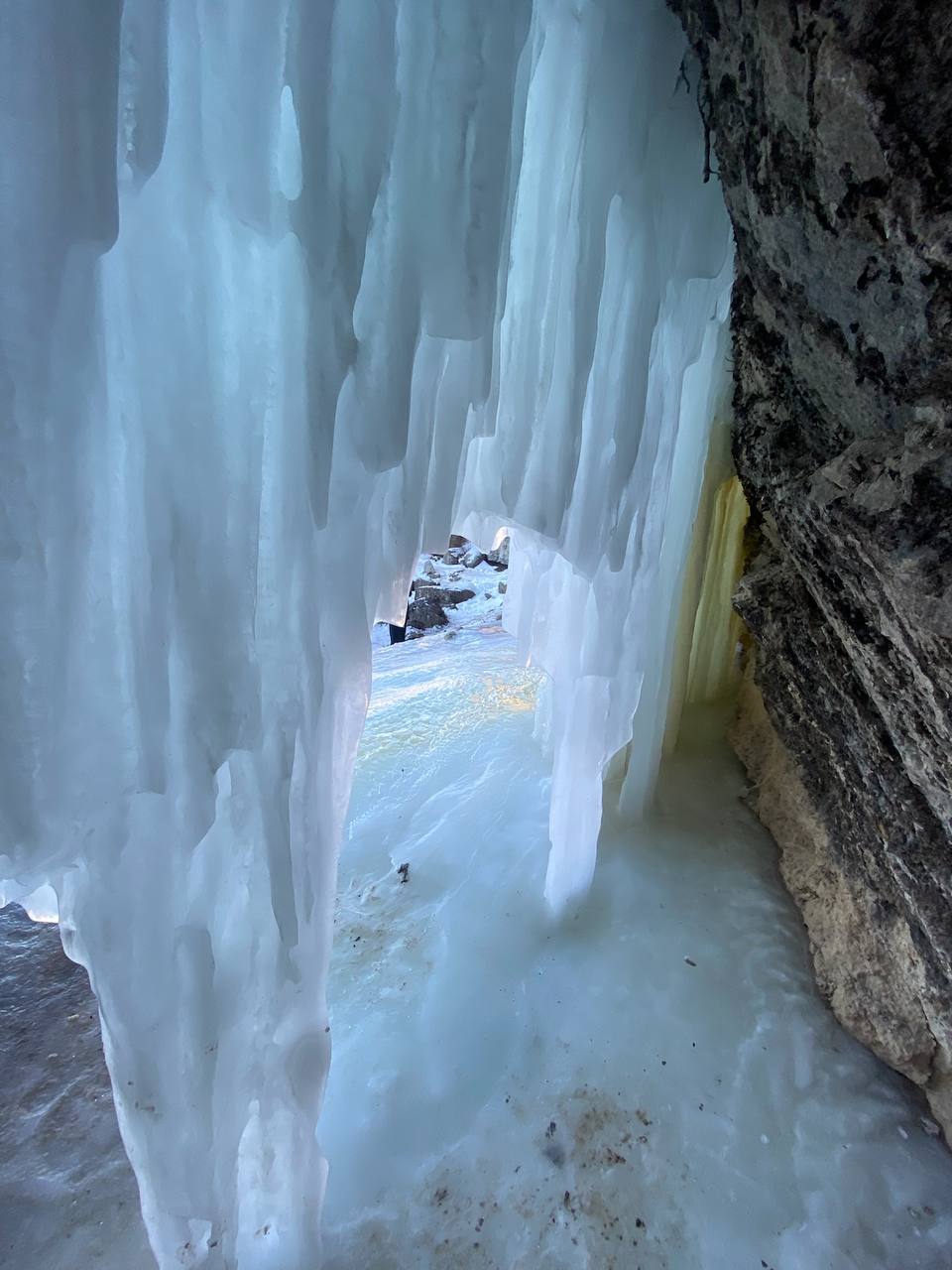 Летом здесь слышен шум воды, а зимой - тишина и неподвижность. Издали водопад напоминает скульптуру, в которой будто застыли струи и отдельные капли.