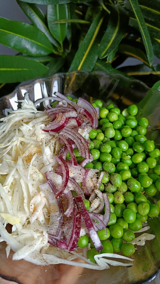 - Белокочанная капуста + зелёный горошек + красный лук. Эта пара станет отличным началом. Капуста с горошком создают удивительный контраст, а добавление красного лука придаёт яркость.