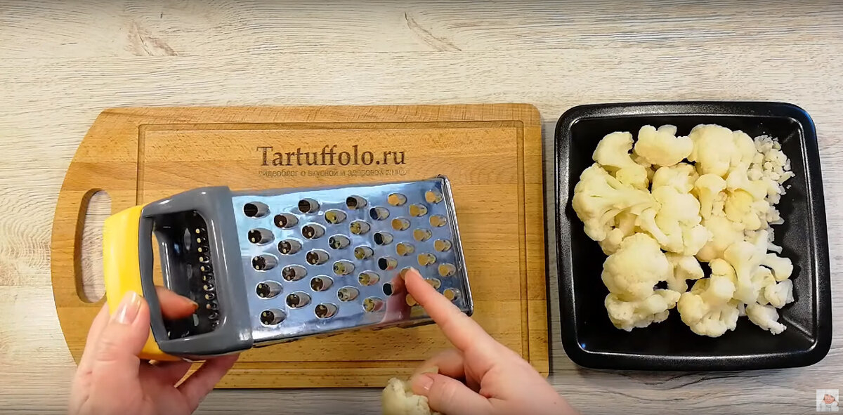 Для начала цветная капуста, размороженная заранее, натирается на крупной терке и помещается в глубокую миску. Далее добавляются яйца — они придадут лепешкам нужную связующую текстуру. Затем следует натереть на мелкой терке сыр, который тут же отправляется в общую массу.