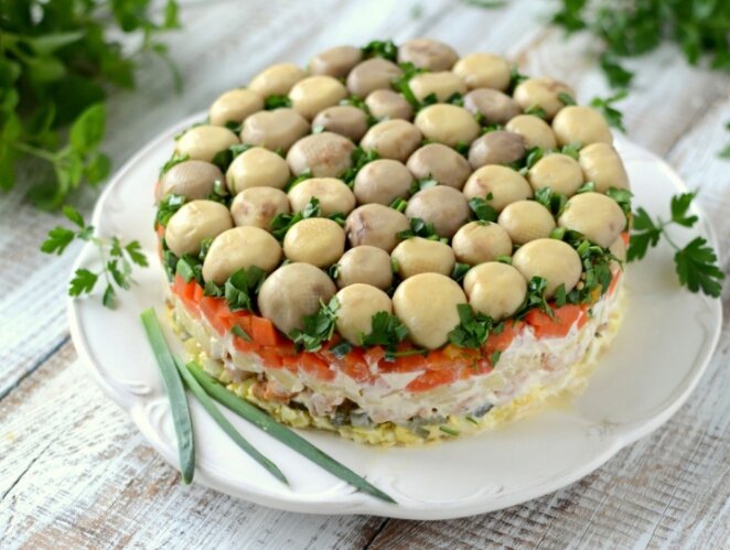 Преимущества Грибной поляны в том, что ее легко адаптировать под свои вкусовые предпочтения. Например, можно добавить консервированную кукурузу или зелень, чтобы придать свежесть и яркий вкус. А для более эффектного вида иногда используют морковь, хотя многие предпочитают делать салат без нее.