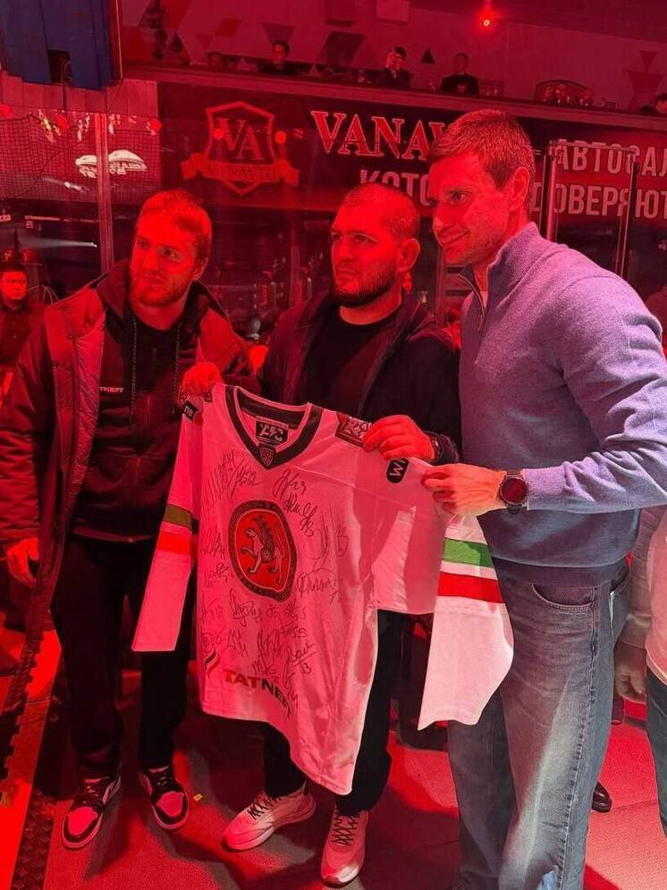 Экс-чемпион UFC в легком весе Хабиб Нурмагомедов во время посещения бойцовского турнира в городе Альметьевске встретился с игроками казанского хоккейного клуба «Ак Барс».