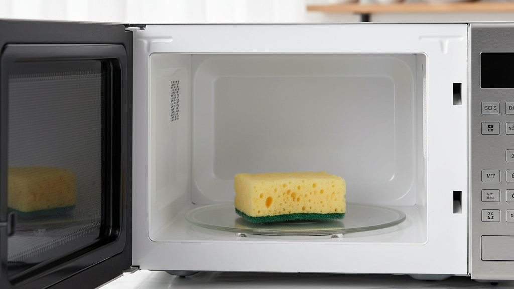 - Губка в микроволновке: намочите губку, положите в микроволновую печь и включите на 30 секунд. Пар поможет смягчить жирный налет, и остальное дело за вами — просто протрите поверхность.