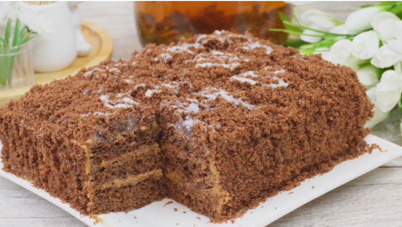 После выпекания корж немного остывает и делится на 2-3 части. Края коржа обрезаются и используют для посыпки торта. Каждый корж промазывают кремом, включая боковые стороны и верх. После посыпки крошками из обрезков и щедрого поливания сгущенным молоком, торт оставляют немного пропитаться. Примечательно, что бисквит уже достаточно влажный, поэтому дополнительная пропитка не требуется.