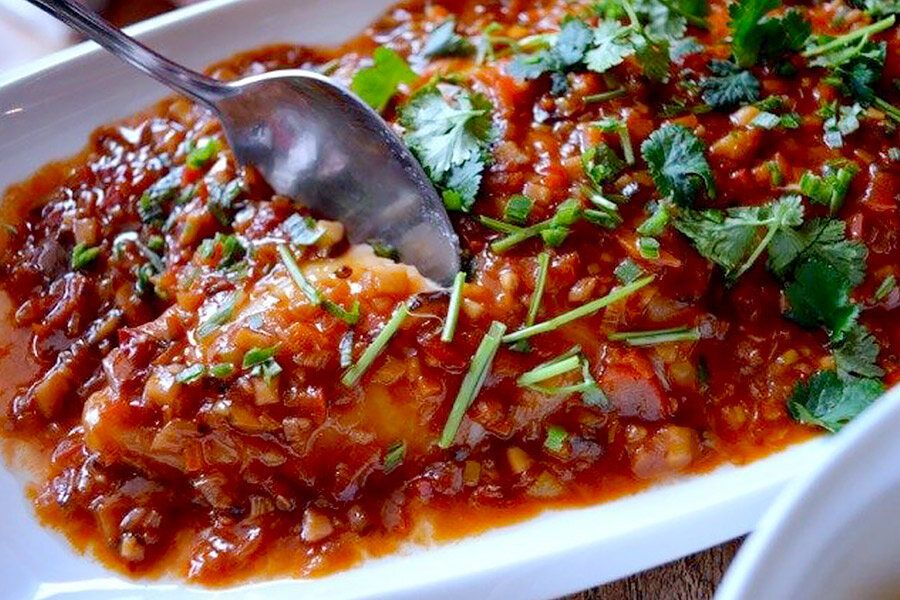 - Готовый соус выливается на рыбу, после чего украшивается свежей кинзой и зеленым луком. Блюдо готово к подаче!