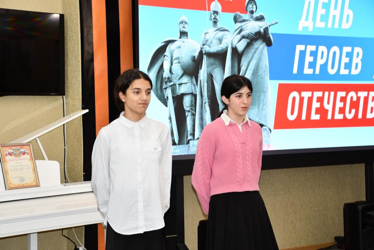 В Центральной модельной библиотеке ЦБС им. Ф. Алиевой состоялся патриотический час «Гордость Отчизны», посвящённый Дню Героев Отечества. Участие в мероприятии приняли ученики 7 «А» класса Школы-интерната № 2.