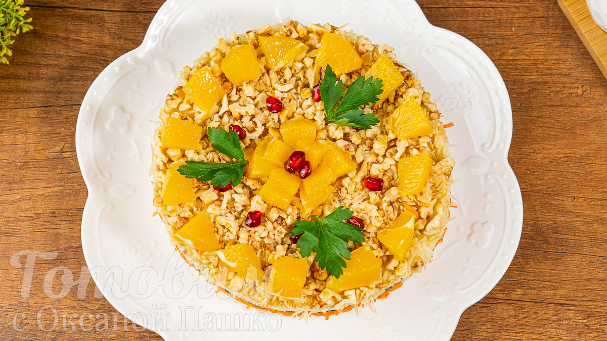 Изюм залить горячей водой на десять минут, затем отварить курицу и нарезать ее кубиками. Морковь и сыр натереть на мелкой терке. Грецкие орехи поджарить на сковороде и нарезать. Салат собирается в слоях с использованием майонеза и перед подачей украшен дольками апельсина и зеленью.