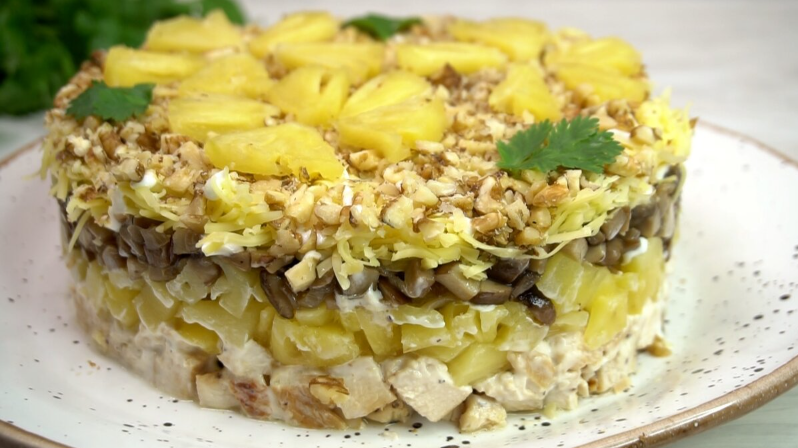 Начинается сборка слоёного салата. Первым слоем укладывают куриное мясо, его смазывают майонезом с добавлением чеснока для аромата. Вторым слоем идут ананасы, также обильно смазанные майонезом. Затем следует грибная начинка, снова — слой майонеза. Салат завершается натёртым сыром и посыпается жареными грецкими орехами.