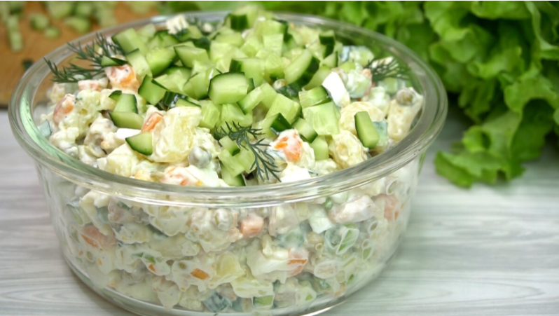 - Оливье «Особенный»: куриное филе, картофель, морковь, свежий огурец, яйца и зеленый горошек составляют основу этого салата. Обжаренная куриная грудка добавляет уникальный вкус, а майонез завершает готовое блюдо.