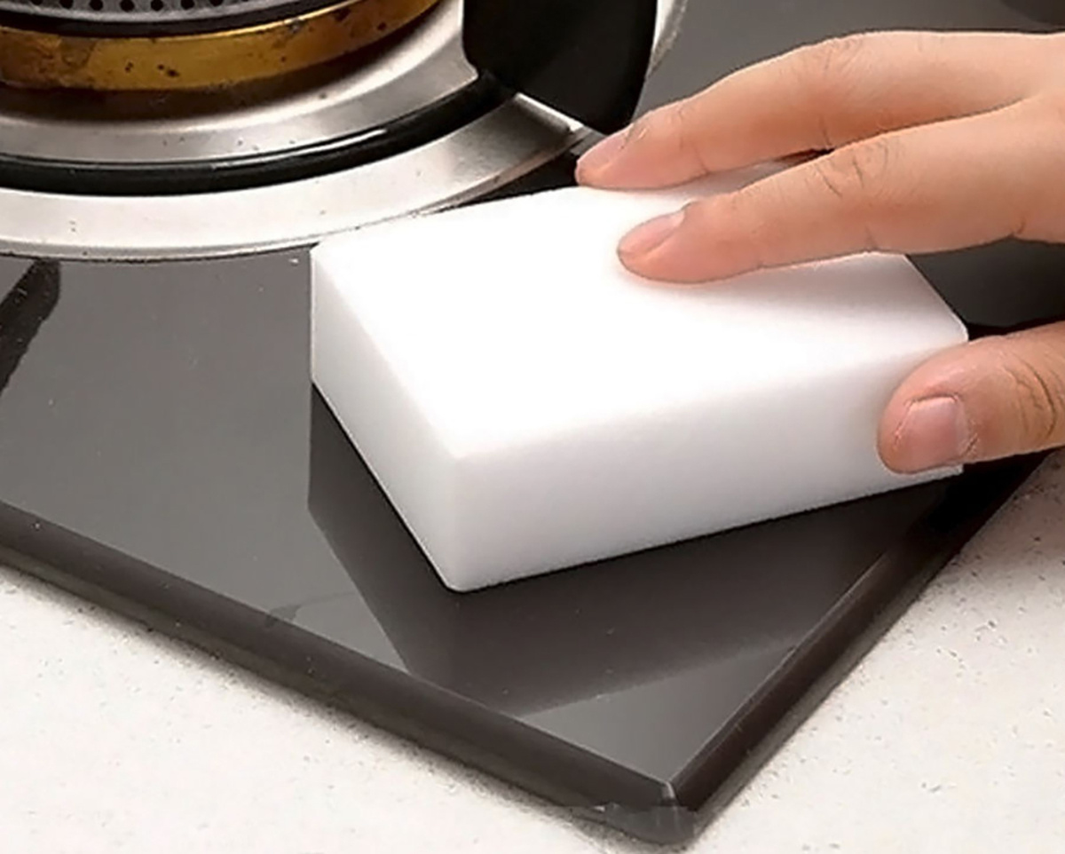 Меламиновая губка, напоминающая ластик, сделана из вспененного меламина. По своей структуре она схожа с жестким поролоном, обладая абразивными свойствами, которые позволяют ей эффективно удалять грязь, не повреждая поверхность.