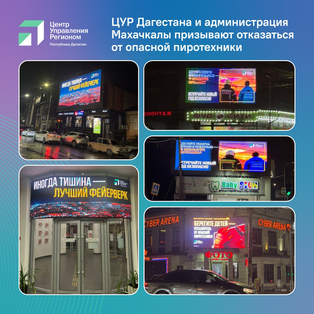 Центр управления регионом Дагестана совместно с Управлением торговли, предпринимательства и рекламы администрации Махачкалы продолжают работу по развитию социальной рекламы в городе. В преддверии новогодних праздников стартовала новая информационная кампания, посвящённая безопасному использованию либо отказу от использования пиротехники.