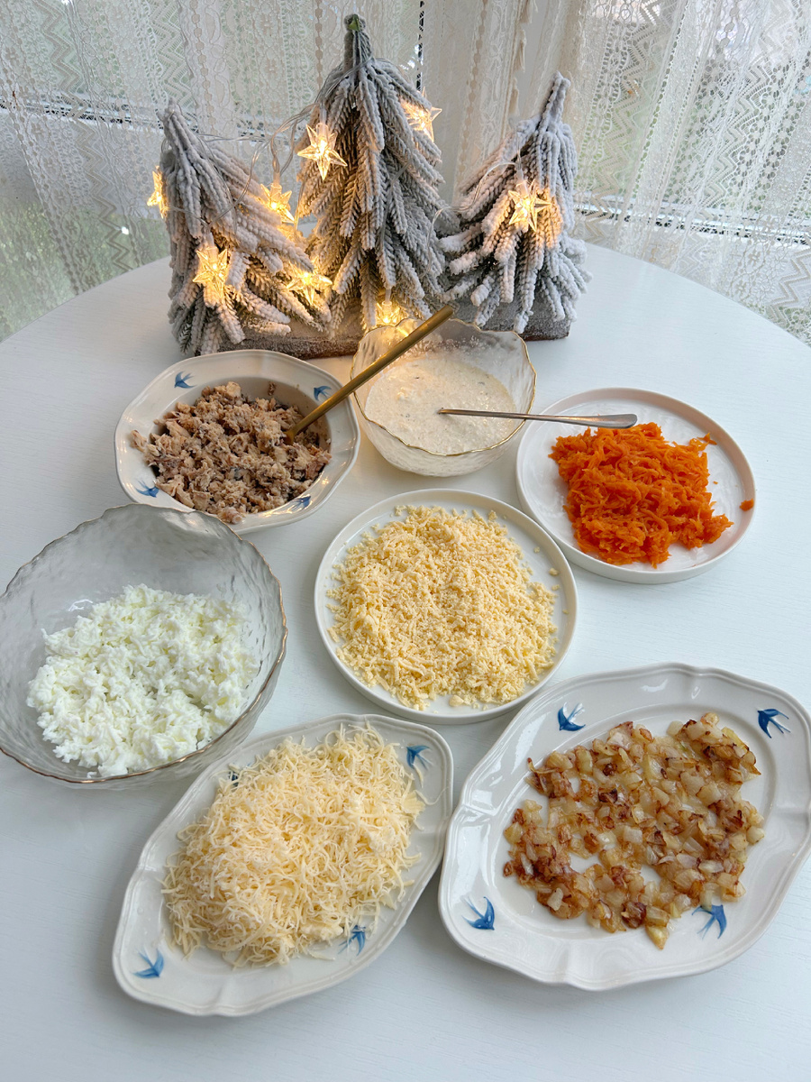 3. Теперь можно собирать салат: на дно выкладываются измельчённые белки, затем слой горбуши, тертый сыр и половина соуса. Следующим слоем будет жареный лук, за ним — натертая морковь. После этого добавляется вторая половина соуса, а в завершение — крошка из варёных желтков для украшения.