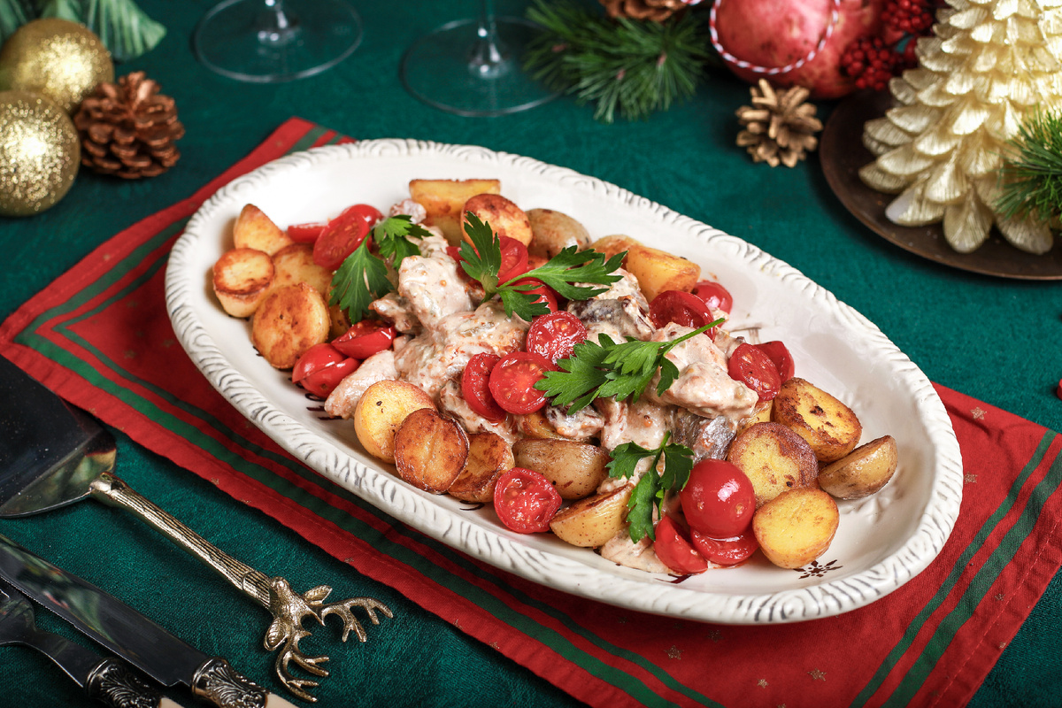 Шаг 4: Когда картофель немного остынет, нарежьте его пополам. На разогретой сковороде обжарьте половинки картофеля до золотистой корочки, после чего добавьте помидоры черри и готовьте еще 30 секунд.