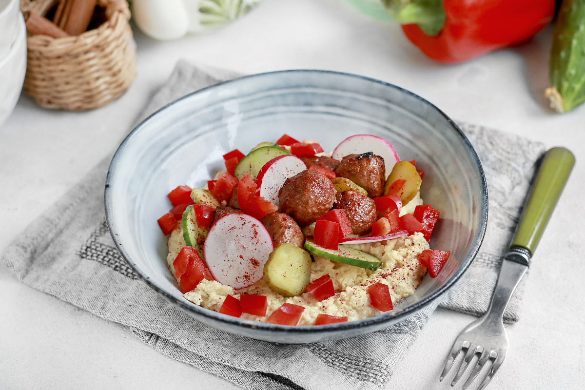 Это блюдо станет не только прекрасным дополнением к обеду, но и отличным выбором для тех, кто ищет здоровье в каждом приеме пищи. Овощи, богатые витаминами, полезные жировые кислоты из оливкового масла и питательные вещества из хумуса создают гармоничное сочетание, способствующее укреплению организма.