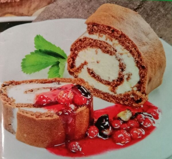 На остывший бисквит равномерно наносится крем, затем с помощью полотенца рулет аккуратно сворачивается. Завернутый рулет обсыпается оставшимся какао-порошком, укладывается швом вниз и оставляется на 40-60 минут для пропитки. При подаче рулет нарезается и сопровождается вишневым вареньем, что придаёт ему фруктовый акцент.