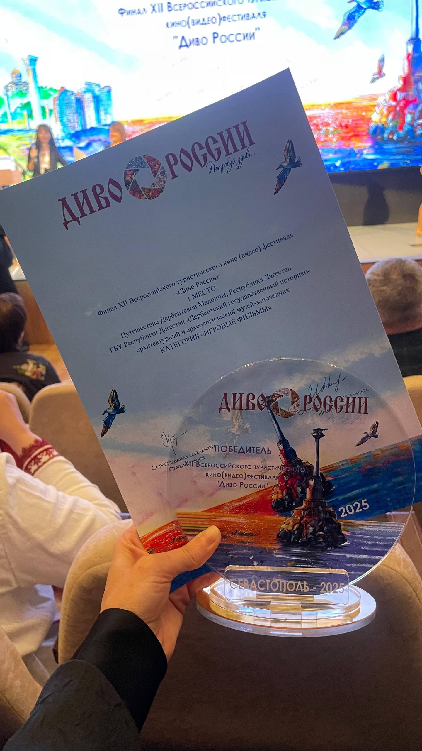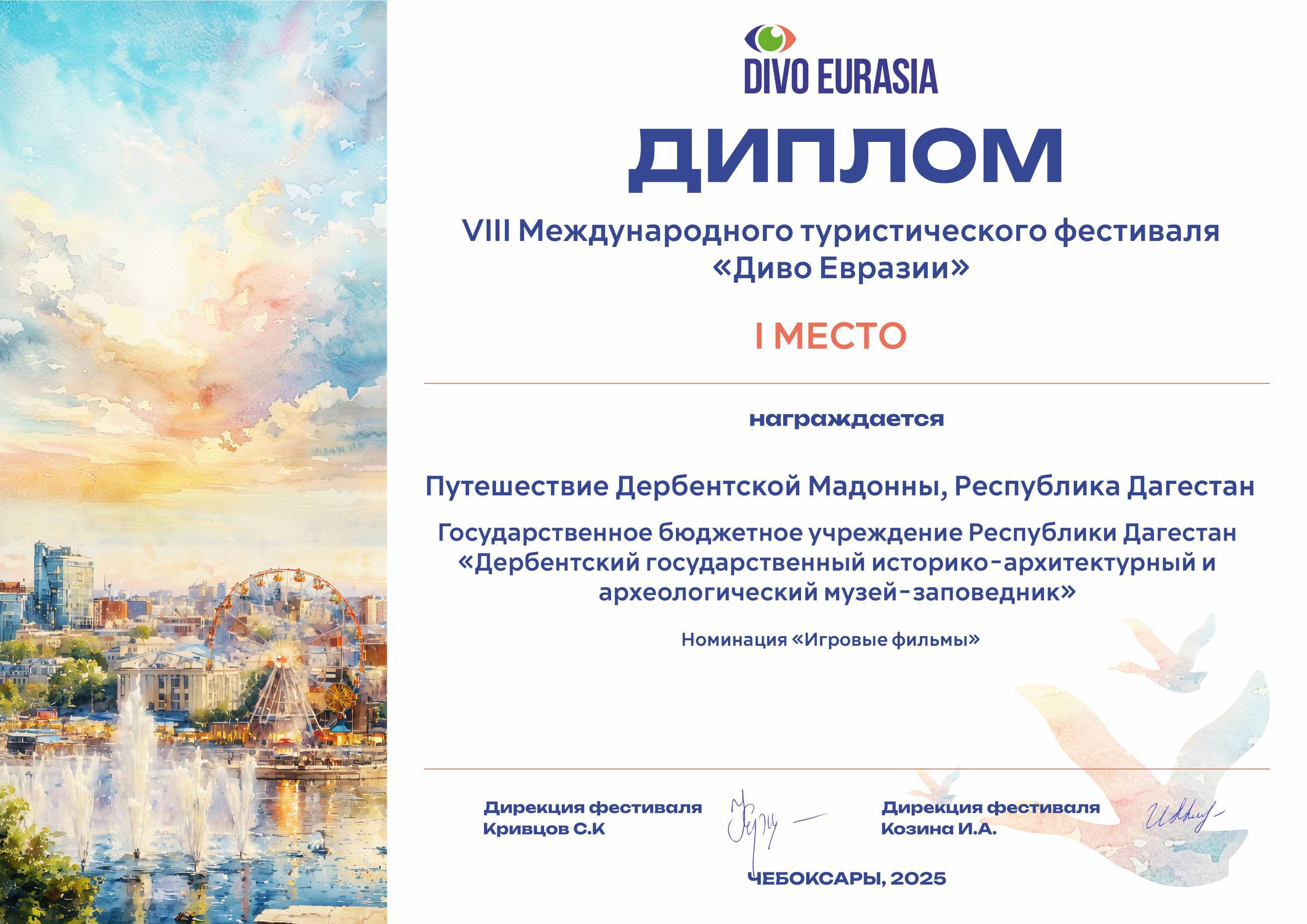 Каменная скульптура «Дербентская Мадонна» из коллекции Дербентского музея-заповедника одержала победу сразу на двух престижных фестивалях. Уникальный археологический памятник, возраст которого исчисляется веками, сначала был признан лучшим на Всероссийском туристическом кинофестивале «Диво России», а затем получил титул «Дива Евразии» на Международном туристическом фестивале.