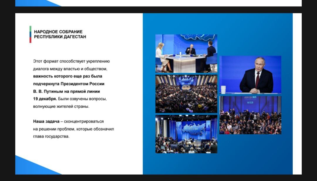Заур Аскендеров отметил, что в повседневной работе депутатского корпуса "наша цель не статистика, а реальный результат. В основе подхода лежит анализ обращений граждан для выявления типичных проблем. Мы перевели взаимодействие из режима реагирования в режим системного анализа и упреждающего решения проблем. Этот формат способствует укреплению диалога между властью и обществом, важность которого ещё раз была подчеркнута Президентом России В.В. Путиным"