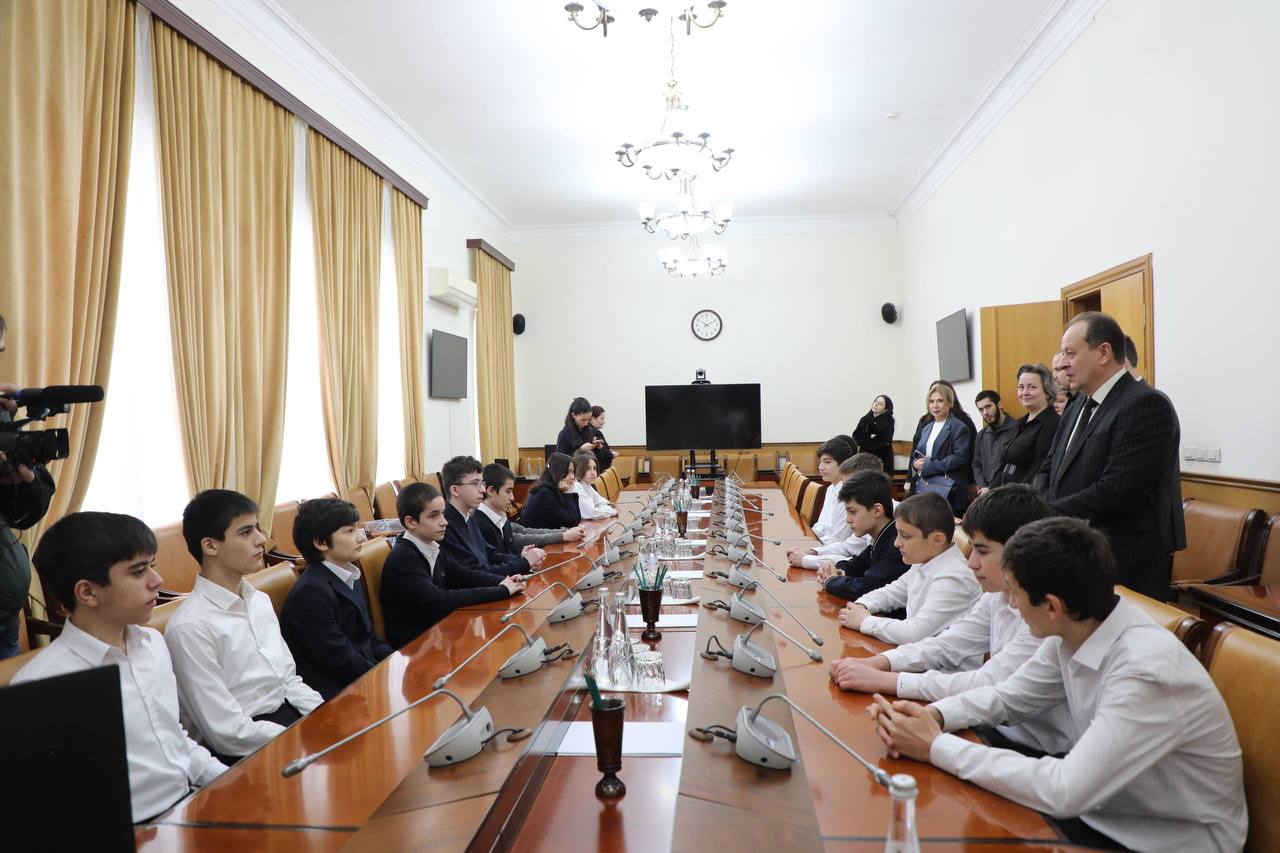 Тепло поприветствовав школьников, премьер-министр предложил ребятам занять главное кресло за столом. Самые решительные сразу же попробовали себя в роли Председателя Правительства республики.
