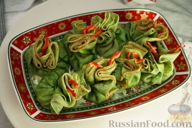 - Блинные мешочки с начинкой: Праздничная закуска, которая представляет собой блинчики, фаршированные куриным филе и овощами в сливочном соусе. Яркие цвета и необычная форма этого блюда притягивают внимание и создают атмосферу праздника.
