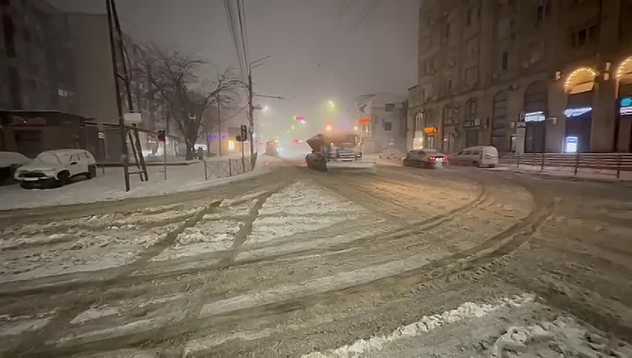 На отдельных улицах и проспектах из-за продолжающегося снегопада уборка проводится повторно.