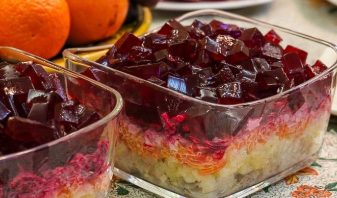 Прежде чем подавать к столу, на верхушку салата укладываются кубики свекольного желе, которые создают изысканное завершение. Селедка под шубой с рубинами готова удивлять и радовать!