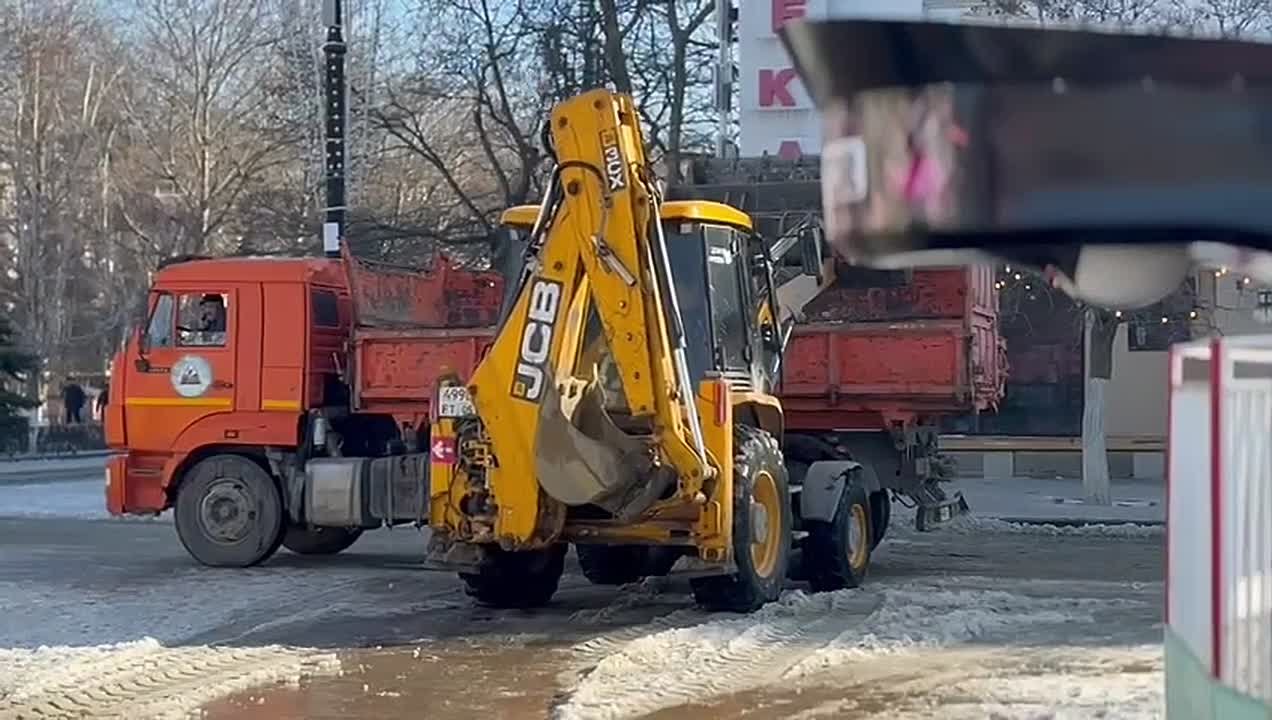 Чтобы не допустить образования новых опасных участков, задействованы сразу несколько единиц техники: малогабаритные погрузчики скребут ледяную корку в труднодоступных местах, а за ними следуют самосвалы, вывозящие груды колотого льда.